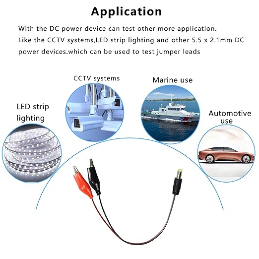Application:With the DC power device can test other more application.Like the CCTV systems,LED strip lighting and other 5.5 x 2.1mm DC power devices.which can be used to test jumper leads.