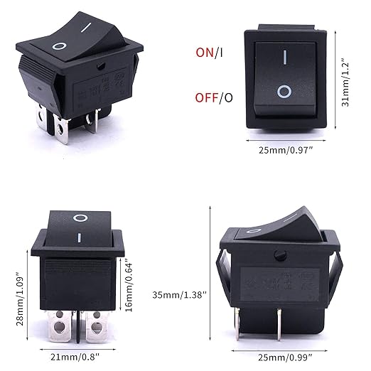 Working voltage and current: 20A / 125V 16A / 250V AC, mounting size: 26 x 21.5 mm / 1.02 inches x 0.55 inches (L x W); Total size: 30 x 25 x 35 mm (L x W x H);